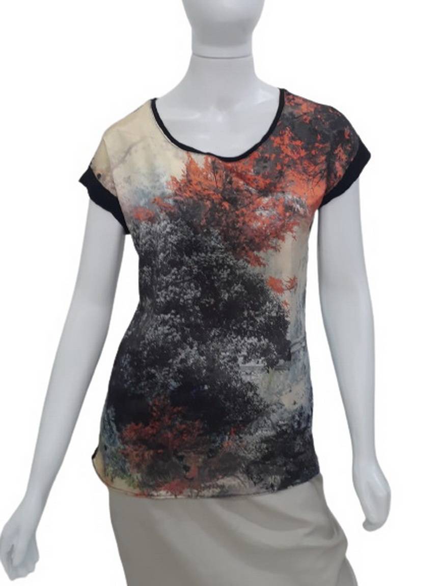 Blusa Marisa Casual, sem mangas, Tam. P. Modelagem reta, cor preta, estampa frontal outono, com brilho. Decote redondo.
